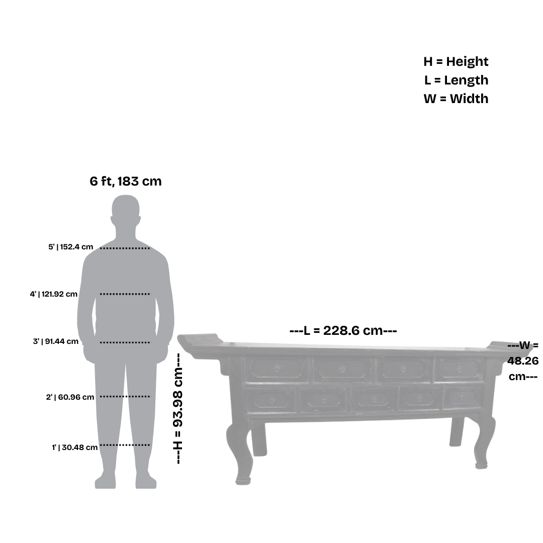 An elegant antique Chinese console crafted in elmwood, featuring a striking black lacquer finish with contrasting red and brown drawer fronts. The console is fitted with multiple drawers, each with simple brass ring pulls, offering both functionality and charm. Its distinctive form includes splayed legs and extended top panels, characteristic of traditional Chinese design. With its patina developed over decades, this piece embodies a balance of refined artistry and practical storage, making it ideal for use as a hallway console, sideboard, or display table.