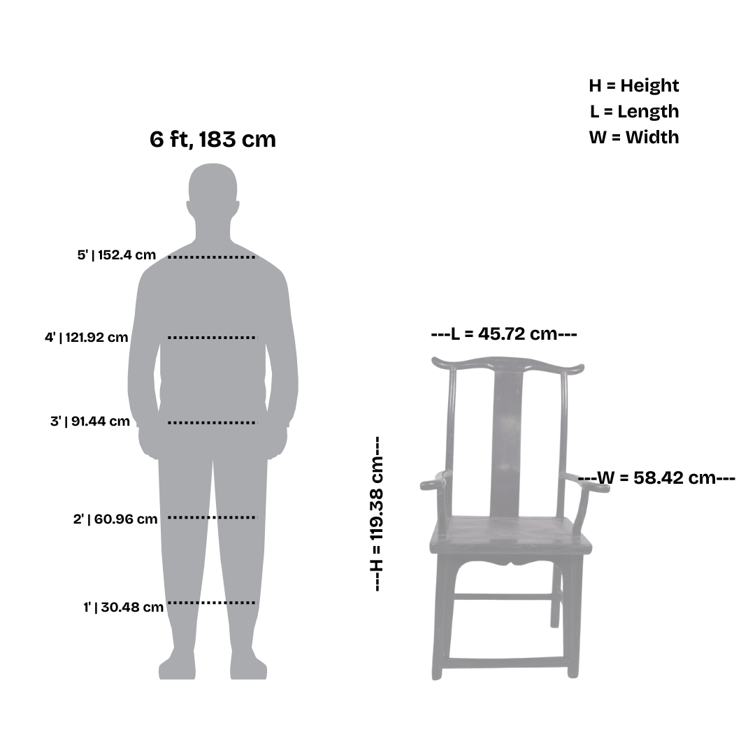 A refined example of a traditional Chinese official’s hat chair, crafted in dark hardwood with graceful proportions. The tall backrest curves gently into the iconic yoke-shaped crest rail, while the outward-sweeping arms add both elegance and comfort. The square seat rests on sturdy legs joined with stretchers for stability, embodying Ming dynasty design aesthetics. Minimalist yet stately, this chair is a symbol of authority and taste, perfect as a statement piece in living rooms, studies, or cultural interiors.