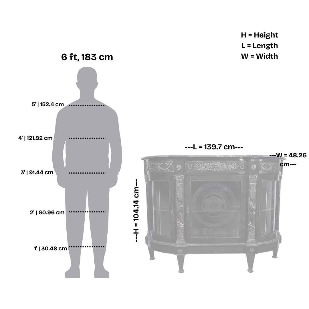 The top is finished in beautifully veined marble, making it an ideal surface to showcase a bust, floral arrangement, or statement decor. Whether placed in a formal living area, dining room, or hallway, this commode effortlessly blends display with storage, becoming the heart of any sophisticated space.