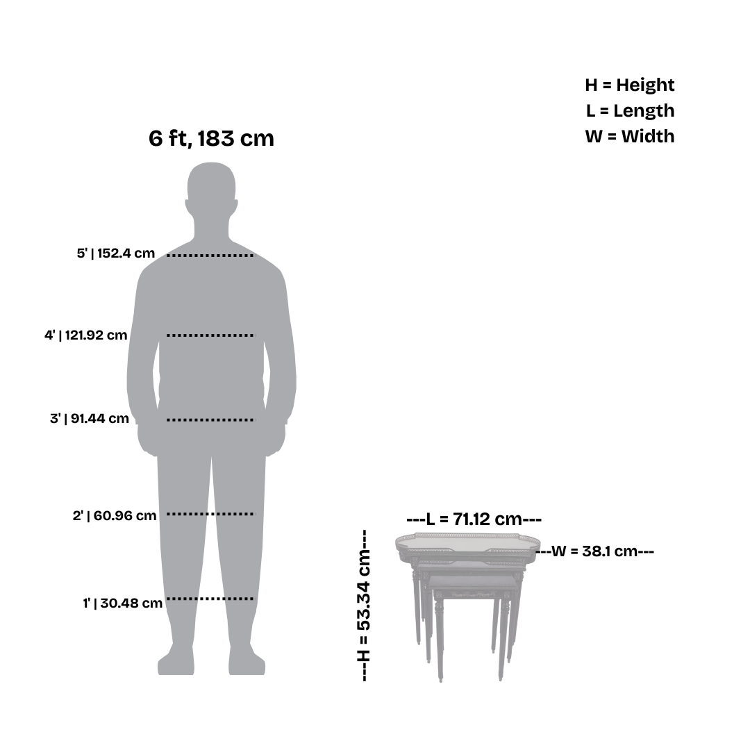 This magnificent French Empire style set of nesting tables is a testament to refined taste and classical artistry. Expertly crafted from rich mahogany, the tables feature finely polished surfaces adorned with intricate marquetry on the lower tiers, depicting central motifs of musical instruments and floral garlands. The upper portions are designed with elegantly shaped edges, providing both functionality and sophisticated visual appeal. Ornate gilt bronze (ormolu) mounts accentuate the corners, drawer fronts, and legs, adding a luxurious touch to the design. Each table is supported by gracefully turned columns further embellished with gilt accents, lending a sense of balance and grandeur. Perfect for a stately entrance hall, luxurious living space, or intimate seating area, these nesting tables serve as both practical surfaces and decorative highlights, offering versatile use while exuding timeless French elegance.