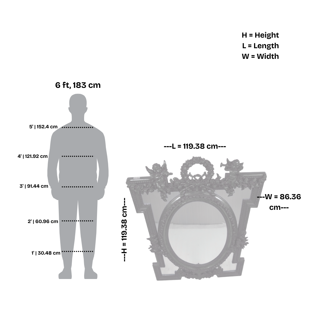 A breathtaking antique mirror featuring a richly ornate gilded frame, combining classical elegance with intricate craftsmanship. The mirror showcases an oval centerpiece surrounded by detailed floral garlands, scrolls, and charming cherub figures, all hand-finished with a luxurious gold leaf. Perfect for adding a touch of opulence to grand living spaces, entryways, or formal rooms.